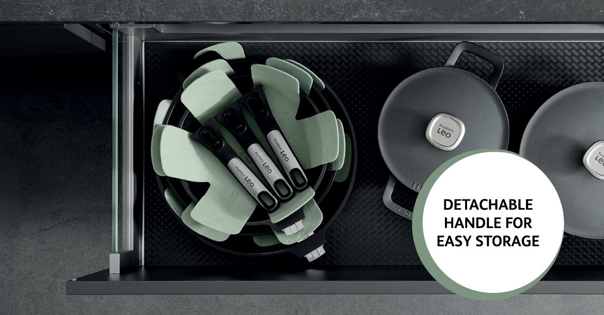 Elegantné hrnce a panvice Leo Phantom, vrátane pokrievok, sa dajú ľahko použiť v rúre až do 230 °C / 446 °F. S odnímateľnými rukoväťami je zaručené optimálne skladovanie a jednoduché použitie v rúre. Odnímateľné silikónové návleky zaistia bezpečné vyberanie hrncov z rúry a bezpečné scedenie vriacej vody. Panvica, panvica na palacinky a wok majú pevnú rukoväť a možno ich použiť v rúre do 180 °C / 356 °F, čo je ideálne na udržanie jedla v teple. Ľahké hliníkové odlievané telo sa ľahko ovláda a je ideálne pre každodenné varenie! Rýchlym pohybom jednou rukou môžete odstrániť rukoväť a použiť panvicu v rúre alebo ju umyť či uskladniť.