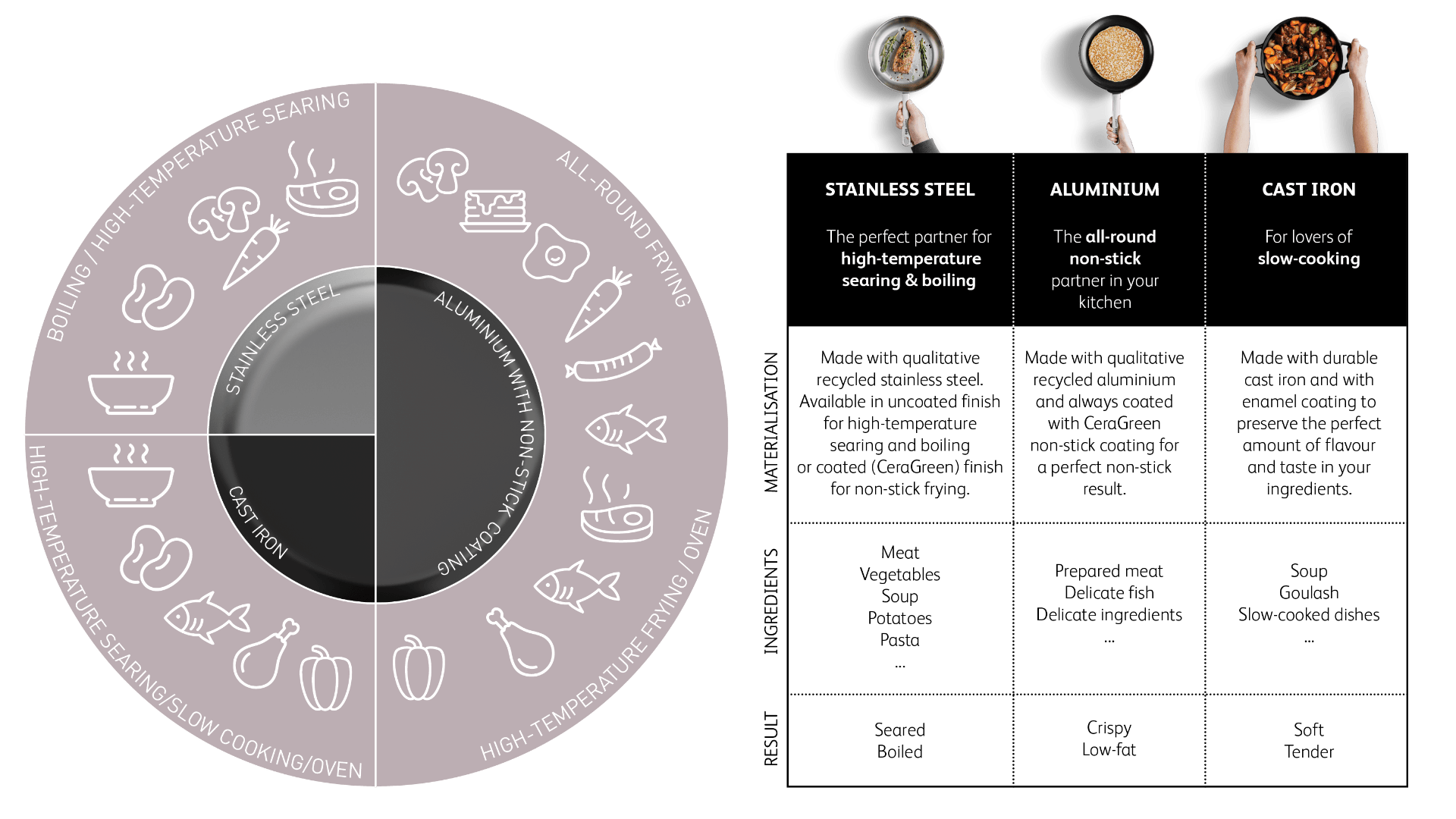 Celkovo BergHOFF ponúka tri typy vysokokvalitných nádob na varenie, ktoré pokryjú všetky ingrediencie a výsledky pečenia: nerezová oceľ: ideálna na varenie, nepriľnavý povrch na varenie: ideálne pre všeobecné smaženie a riad na varenie z liatiny: perfektné na prípravu pomaly dusených gulášov. Nižšie uvedený diagram vám ukazuje dokonalý prehľad s našimi nádobami na varenie na základe vašich ingrediencií a výsledkov pečenia.